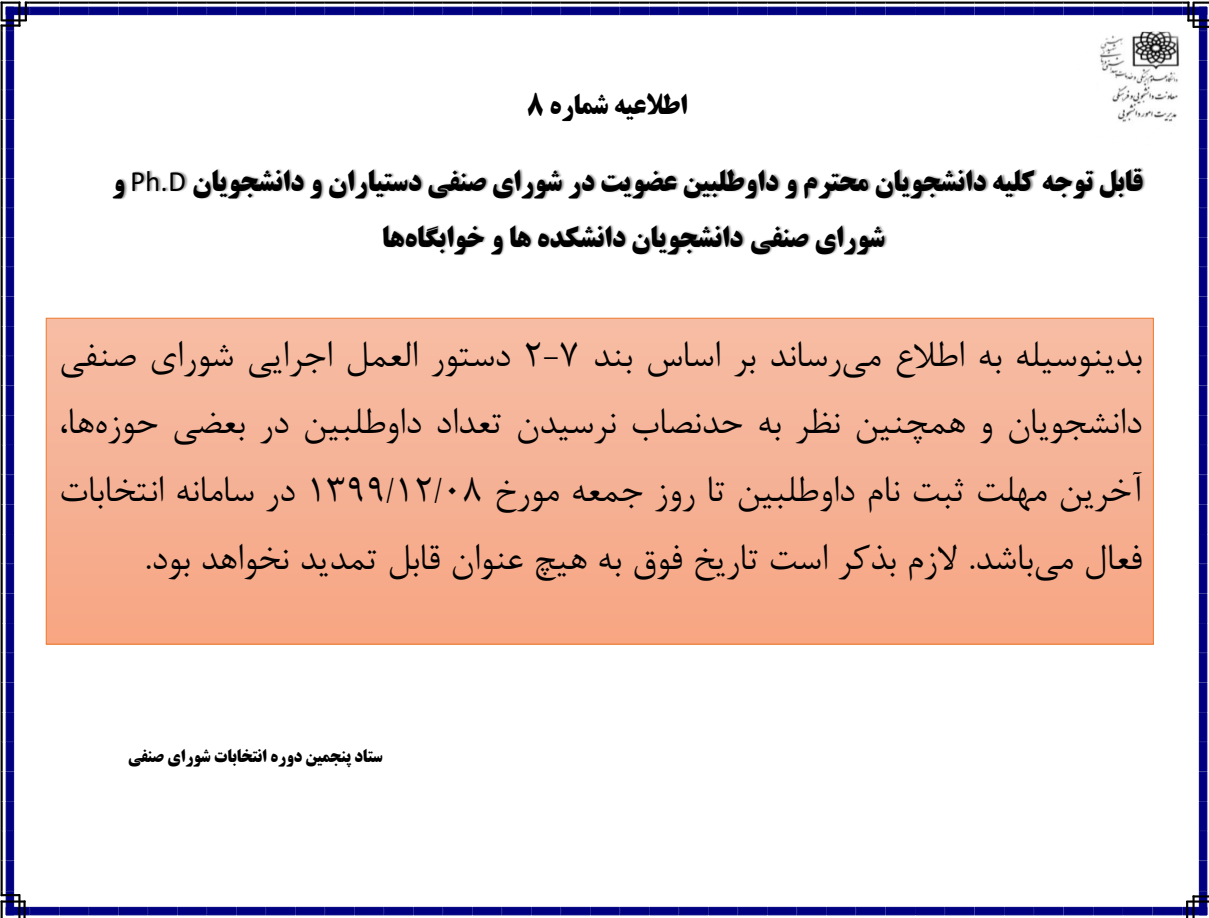 آخرین مهلت ثبت نام در انتخابات شورای صنفی روز جمعه ٨ اسفند ٩٩ می باشد.