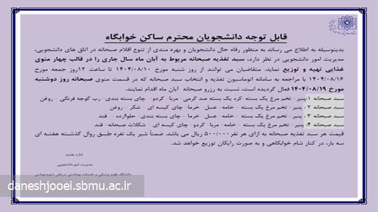 به اطلاع کلیه دانشجویان محترم خوابگاهی می‌رساند؛ دانشجویان می‌توانند از روزشنبه مورخ 1404/08/10 تا ساعت ۱۲ روز جمعه مورخ 1404/08/16 از طریق سامانه تغذیه نسبت به رزرو سبد صبحانه خود اقدام نمایند. جزئیات رزرو در فایل پیوست ذکر شده است.